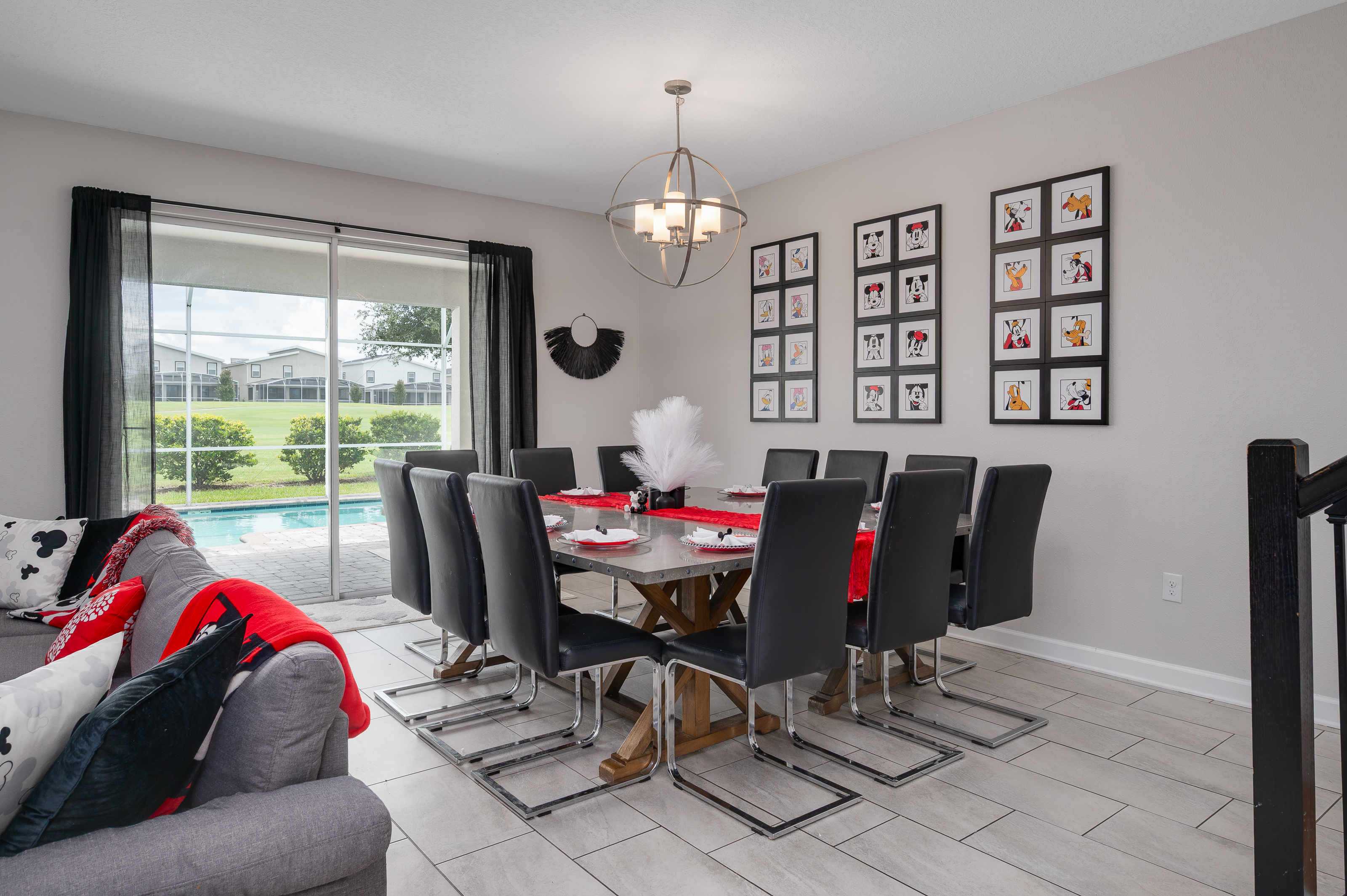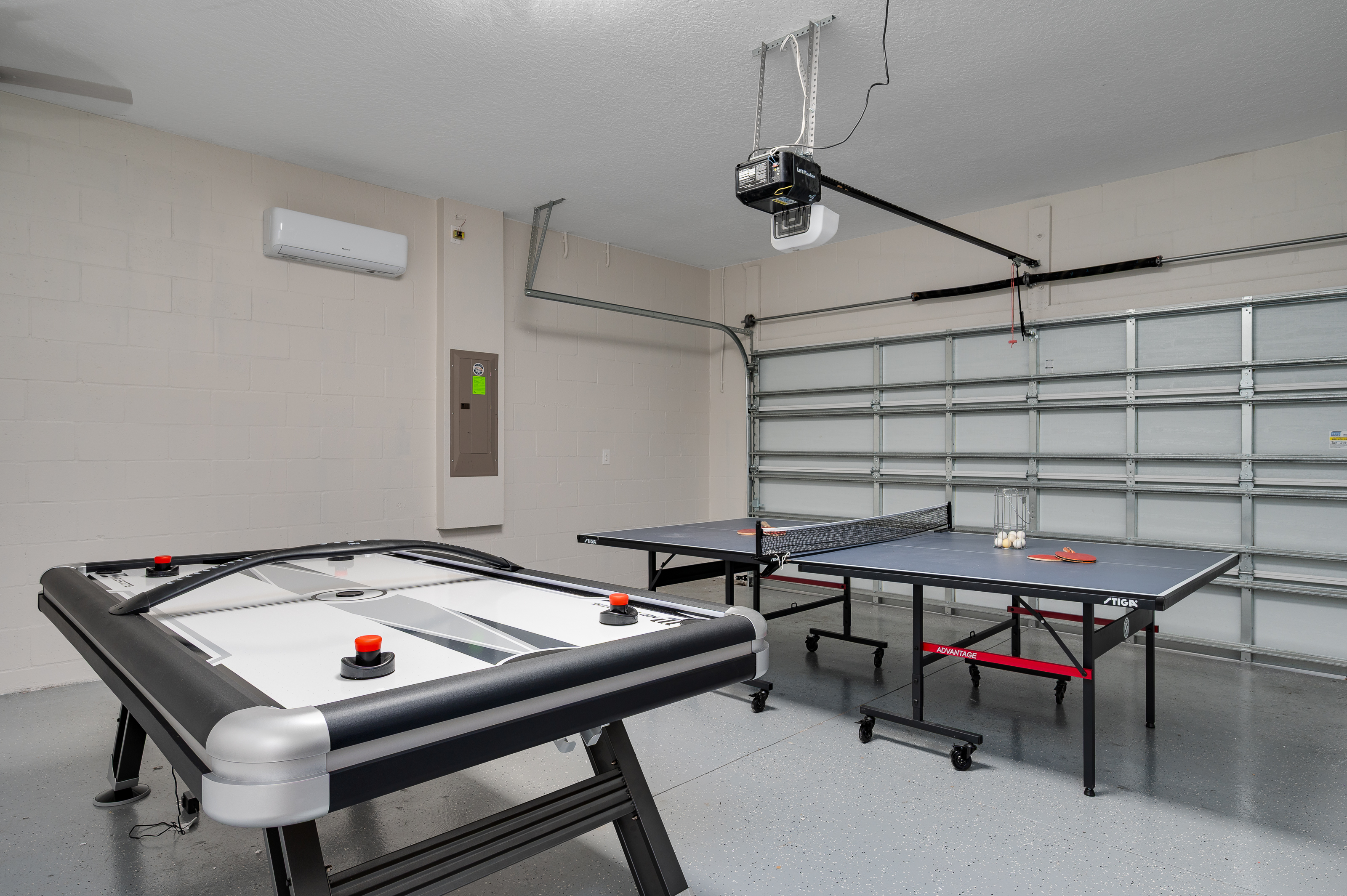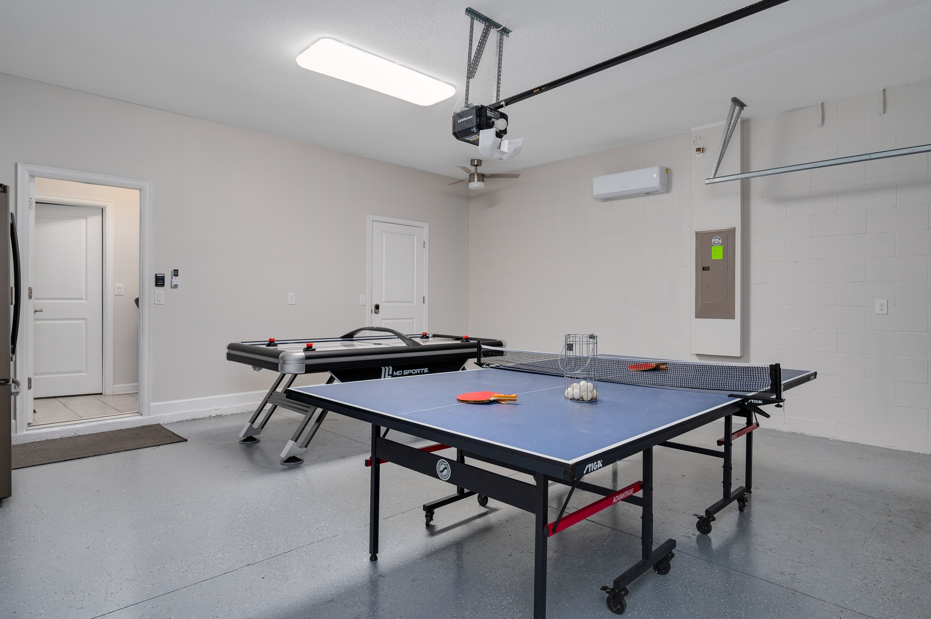 Adjacent to the living area, the dining space provides seating for up to 12 guests, making it easy to gather everyone together for shared meals or game nights. For added entertainment, the garage has been converted into a lively game room featuring a air hockey table, ping pong table and seating for spectators to enjoy the fun.
