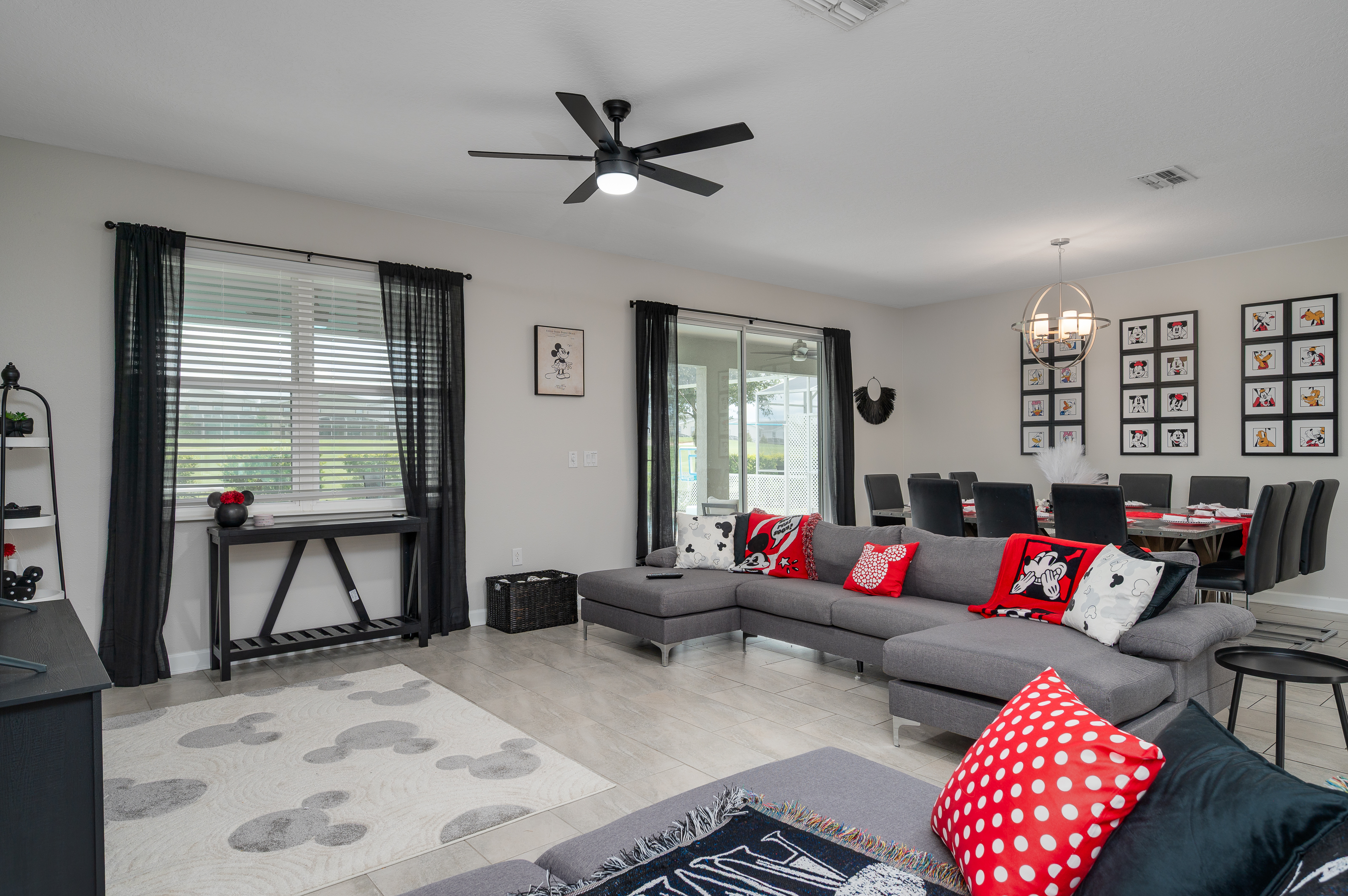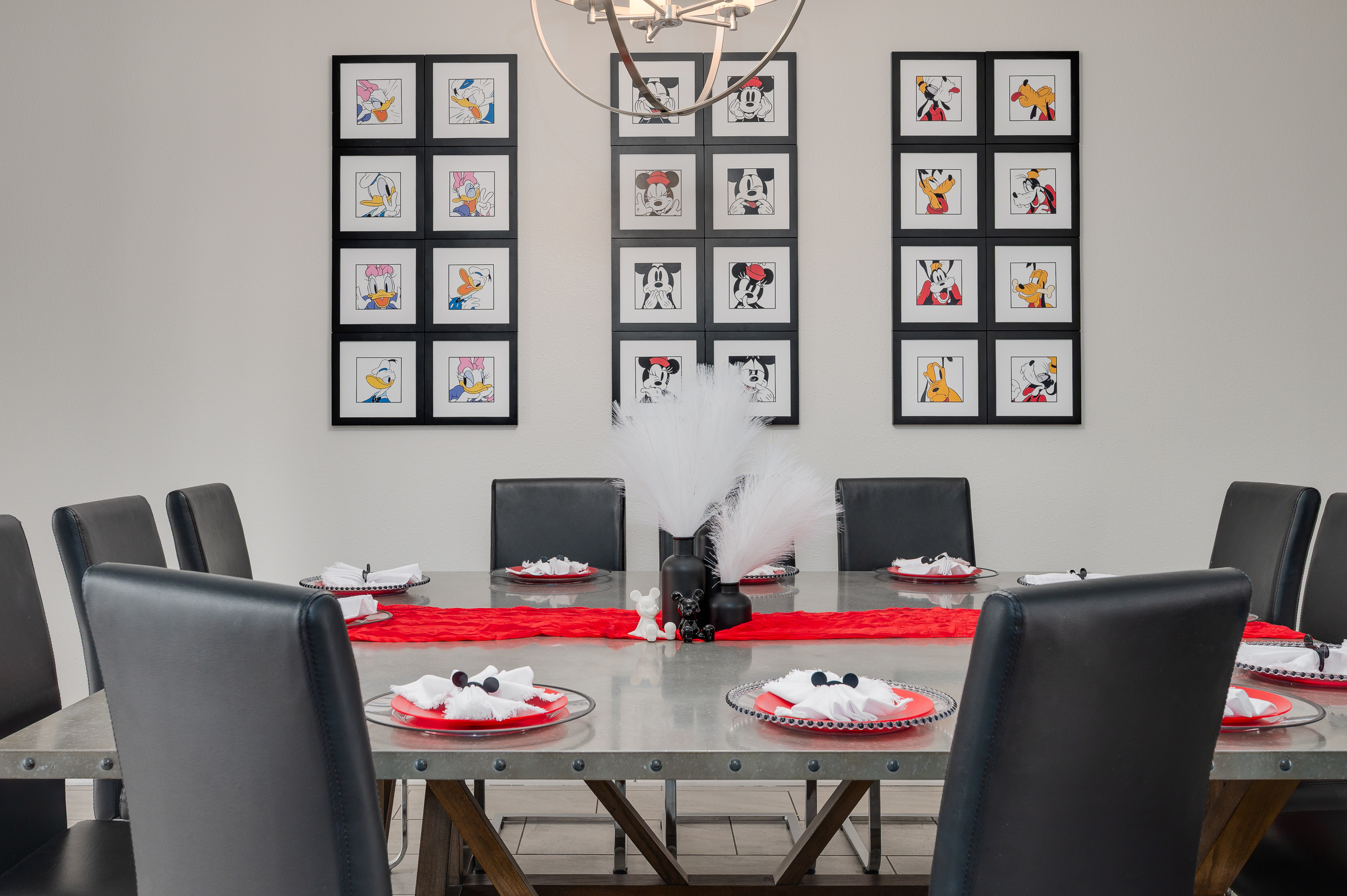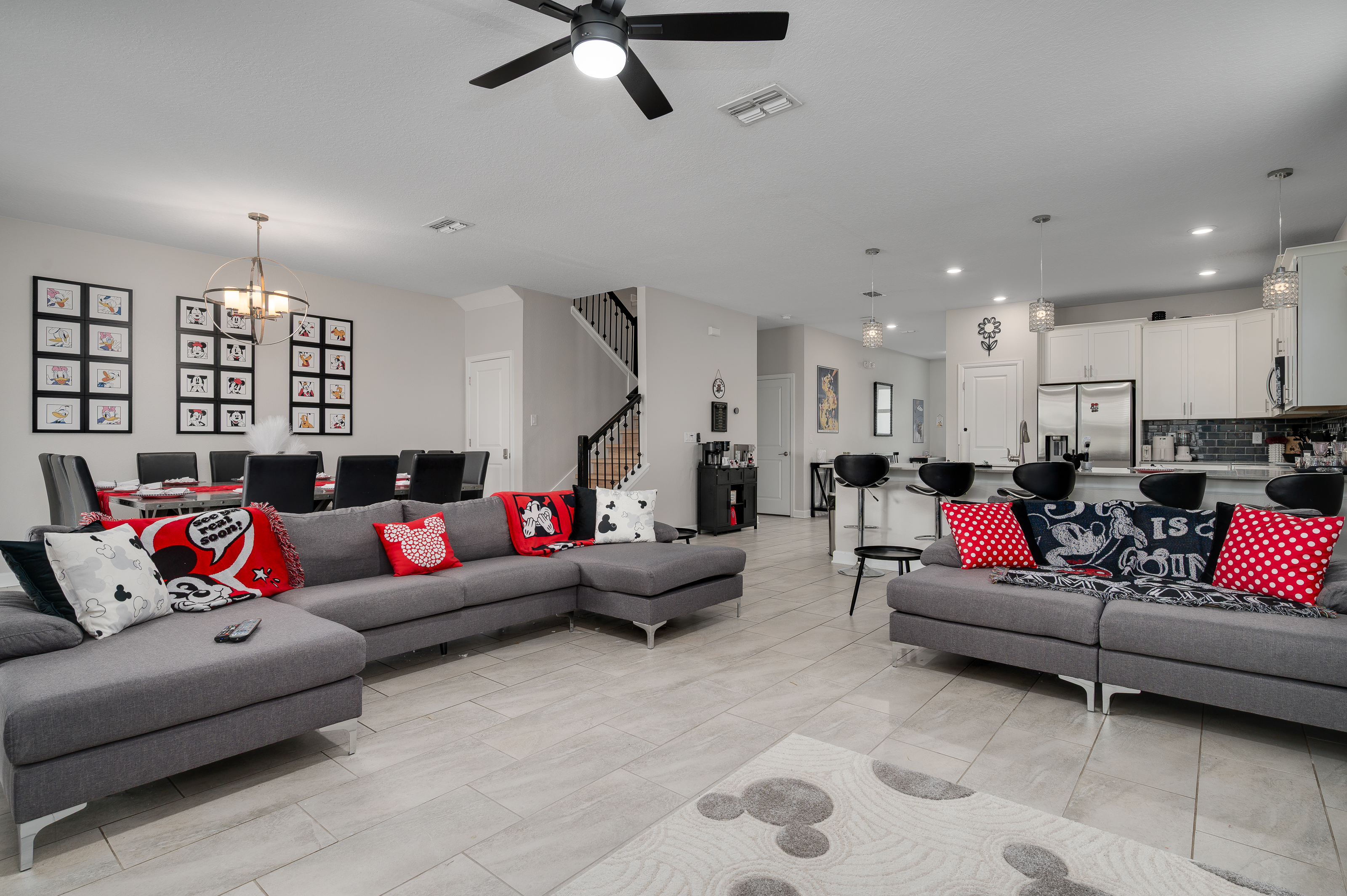 Adjacent to the living area, the dining space provides seating for up to 12 guests, making it easy to gather everyone together for shared meals or game nights. For added entertainment, the garage has been converted into a lively game room featuring a air hockey table, ping pong table and seating for spectators to enjoy the fun.