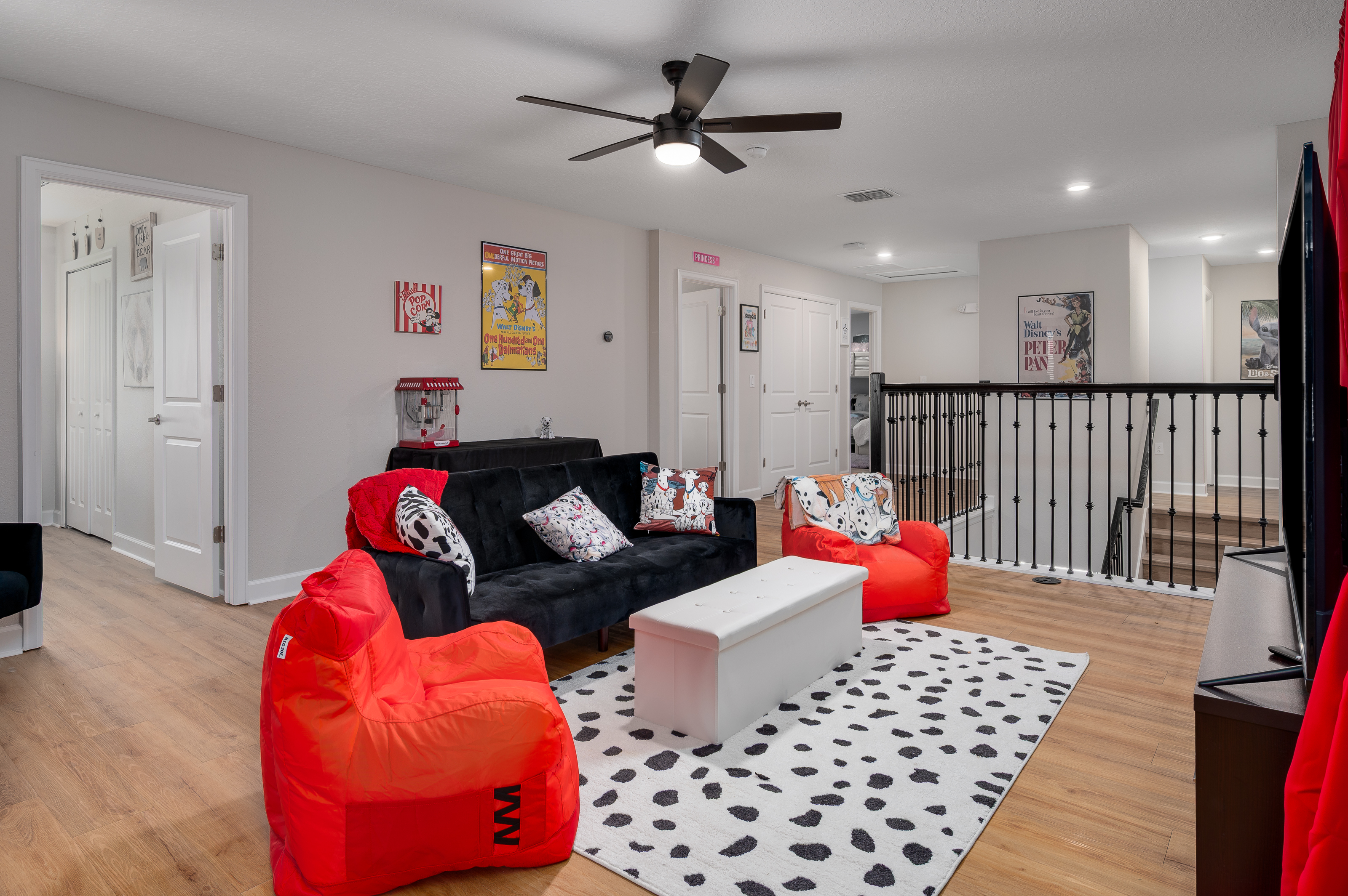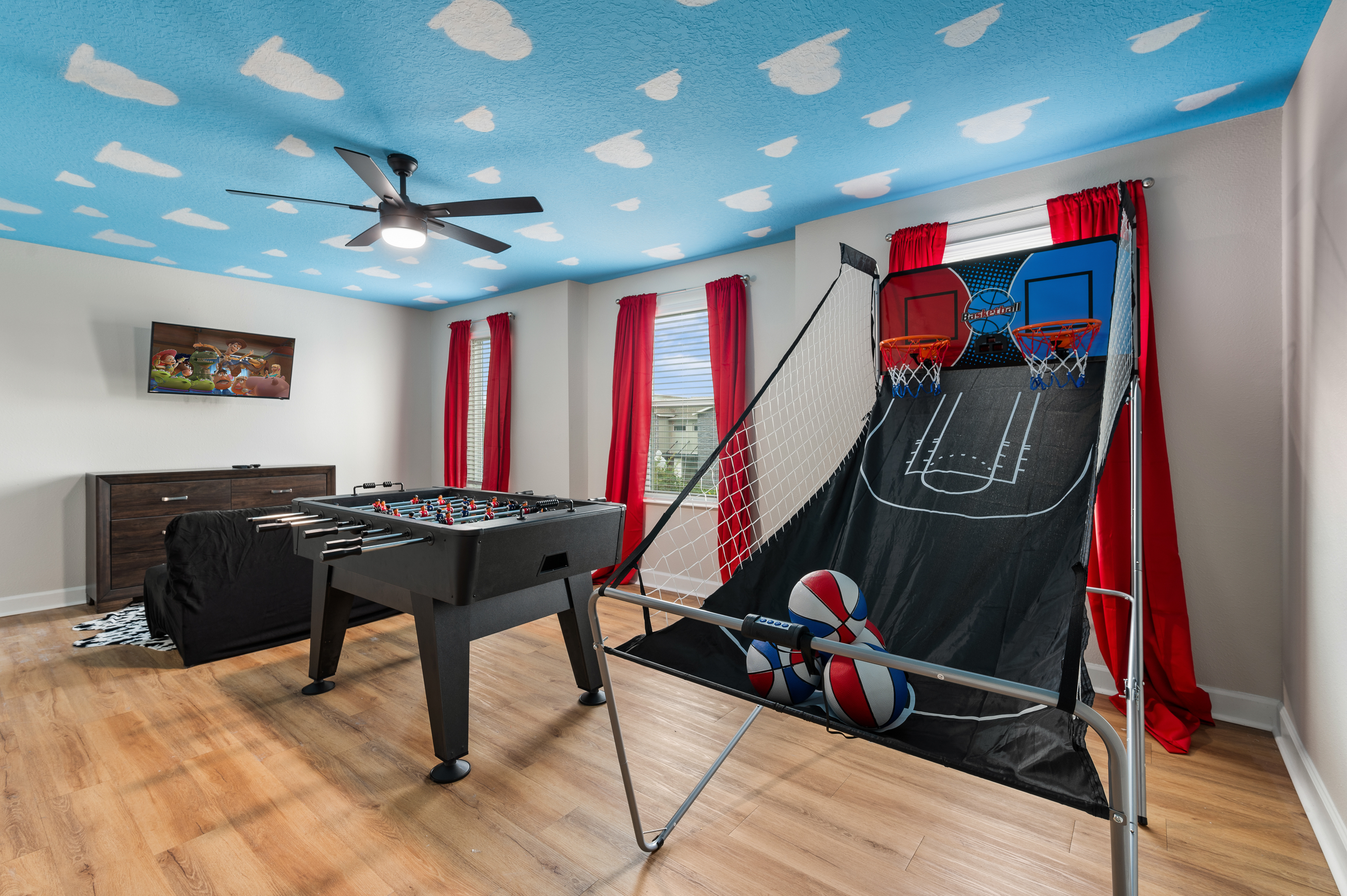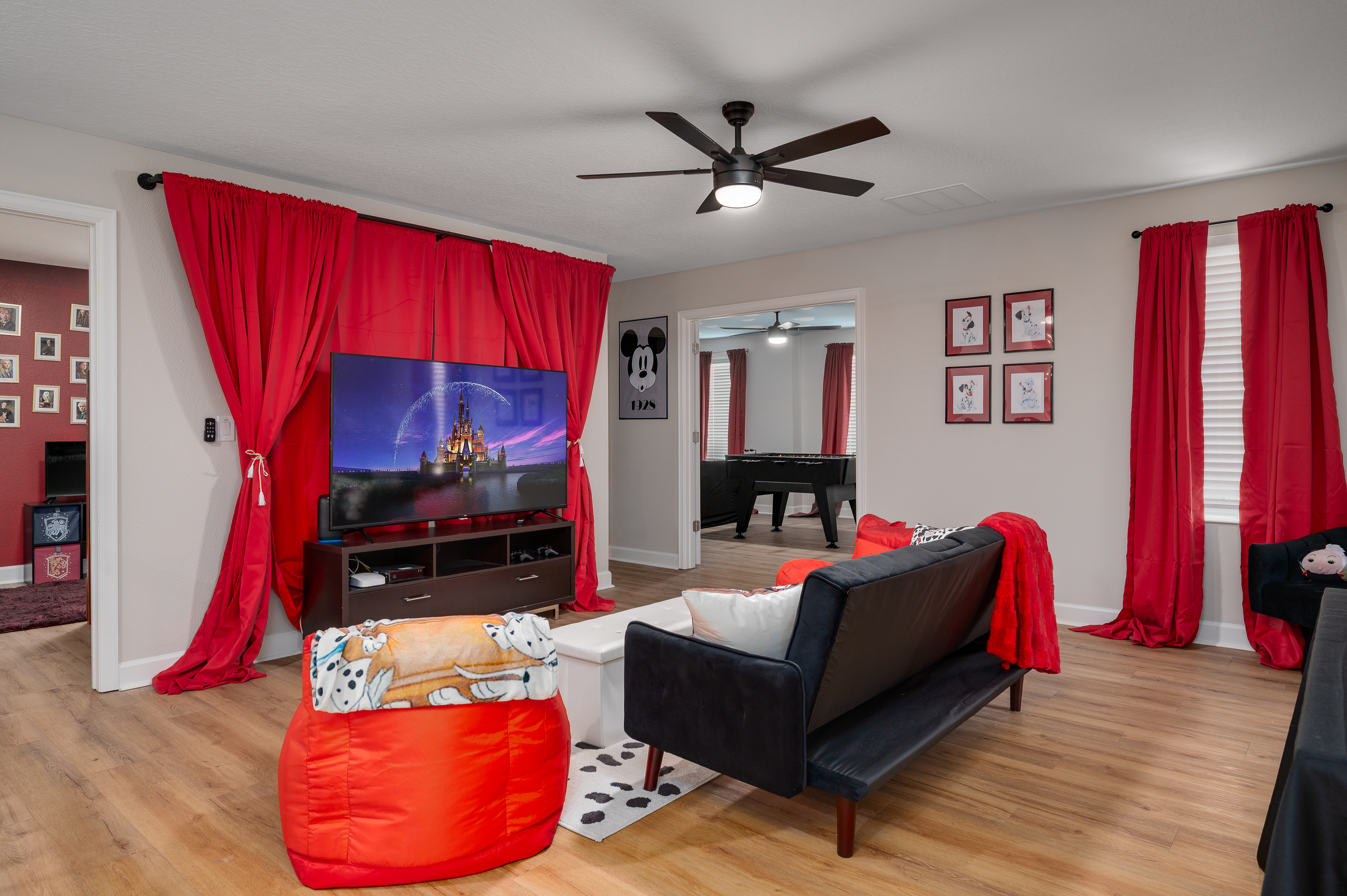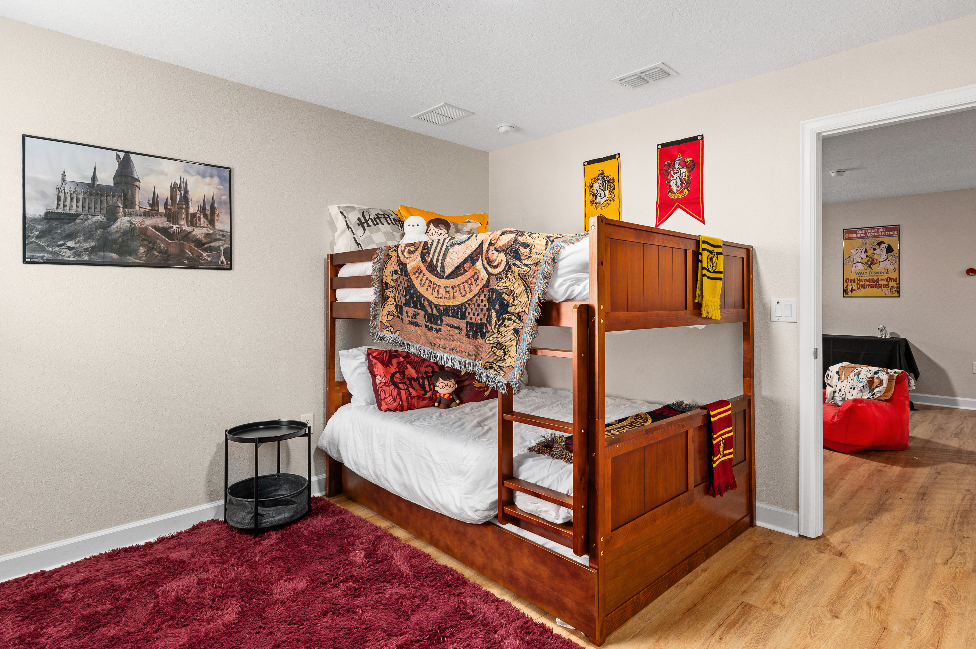 Upstairs, guests will find another entertainment zone with a foosball table and a basketball game—great for friendly competitions or relaxing with snacks and drinks. This floor also hosts six additional bedrooms, including imaginative Princess-themed rooms and Harry Potter–inspired rooms that add a magical touch to the stay. A laundry room and the remaining bathrooms are also conveniently located upstairs.