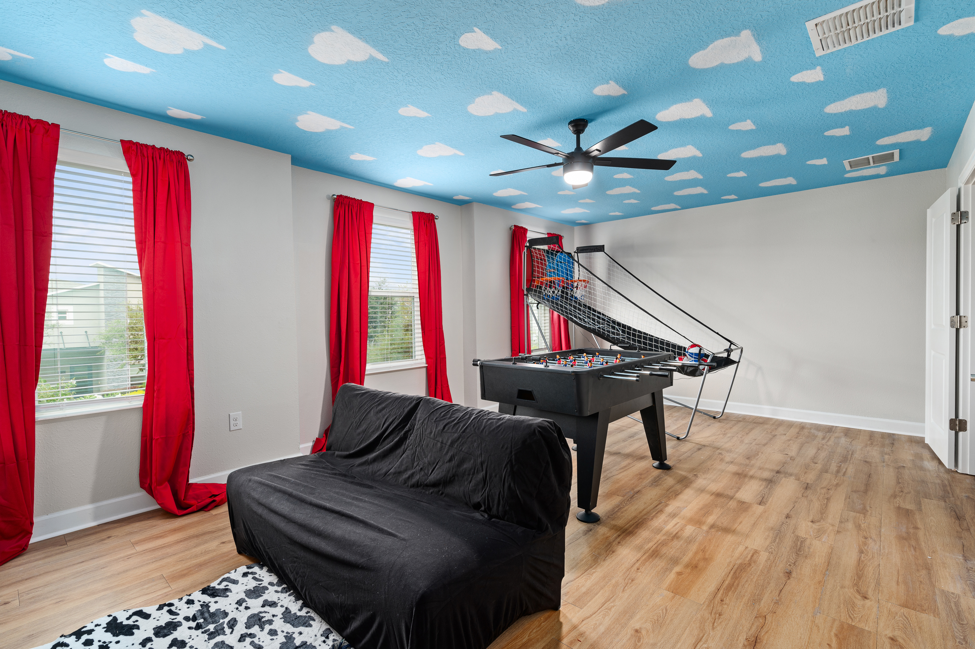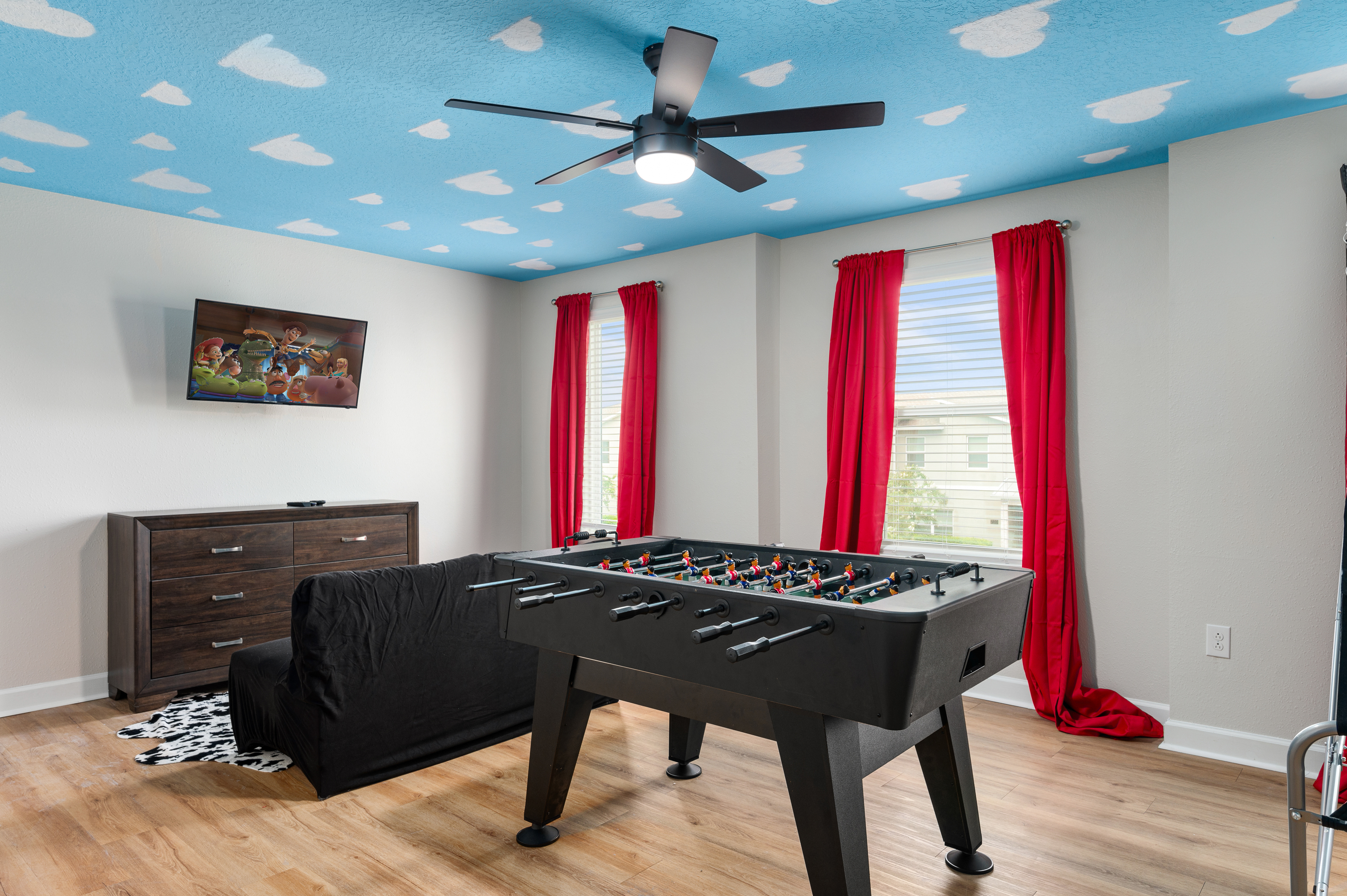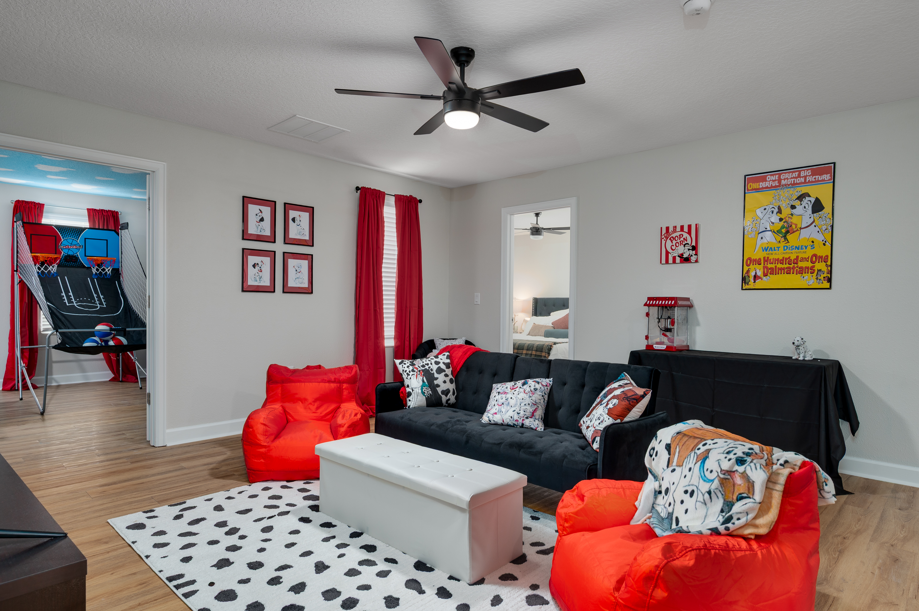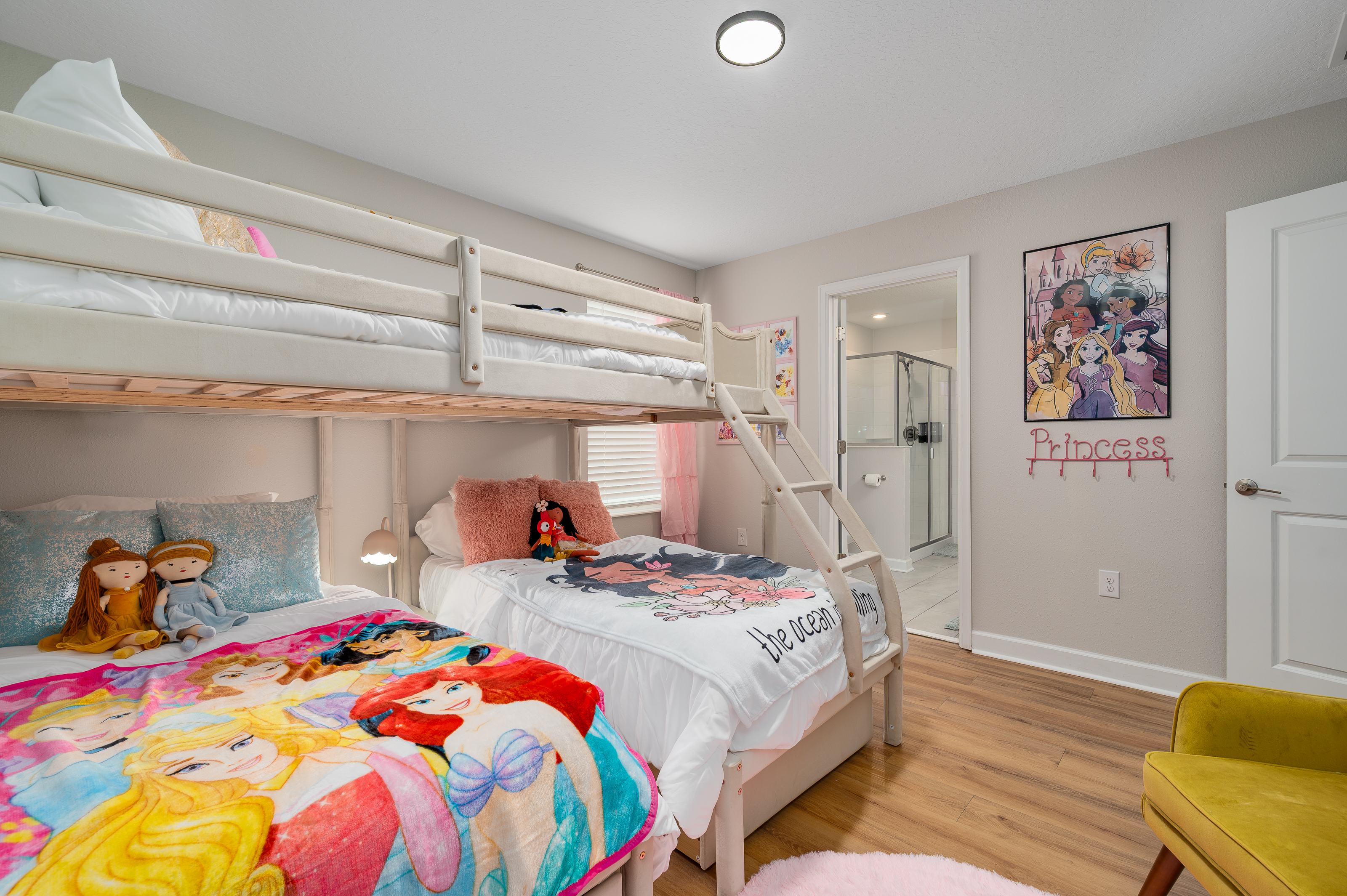 Upstairs, guests will find another entertainment zone with a foosball table and a basketball game—great for friendly competitions or relaxing with snacks and drinks. This floor also hosts six additional bedrooms, including imaginative Princess-themed rooms and Harry Potter–inspired rooms that add a magical touch to the stay. A laundry room and the remaining bathrooms are also conveniently located upstairs.