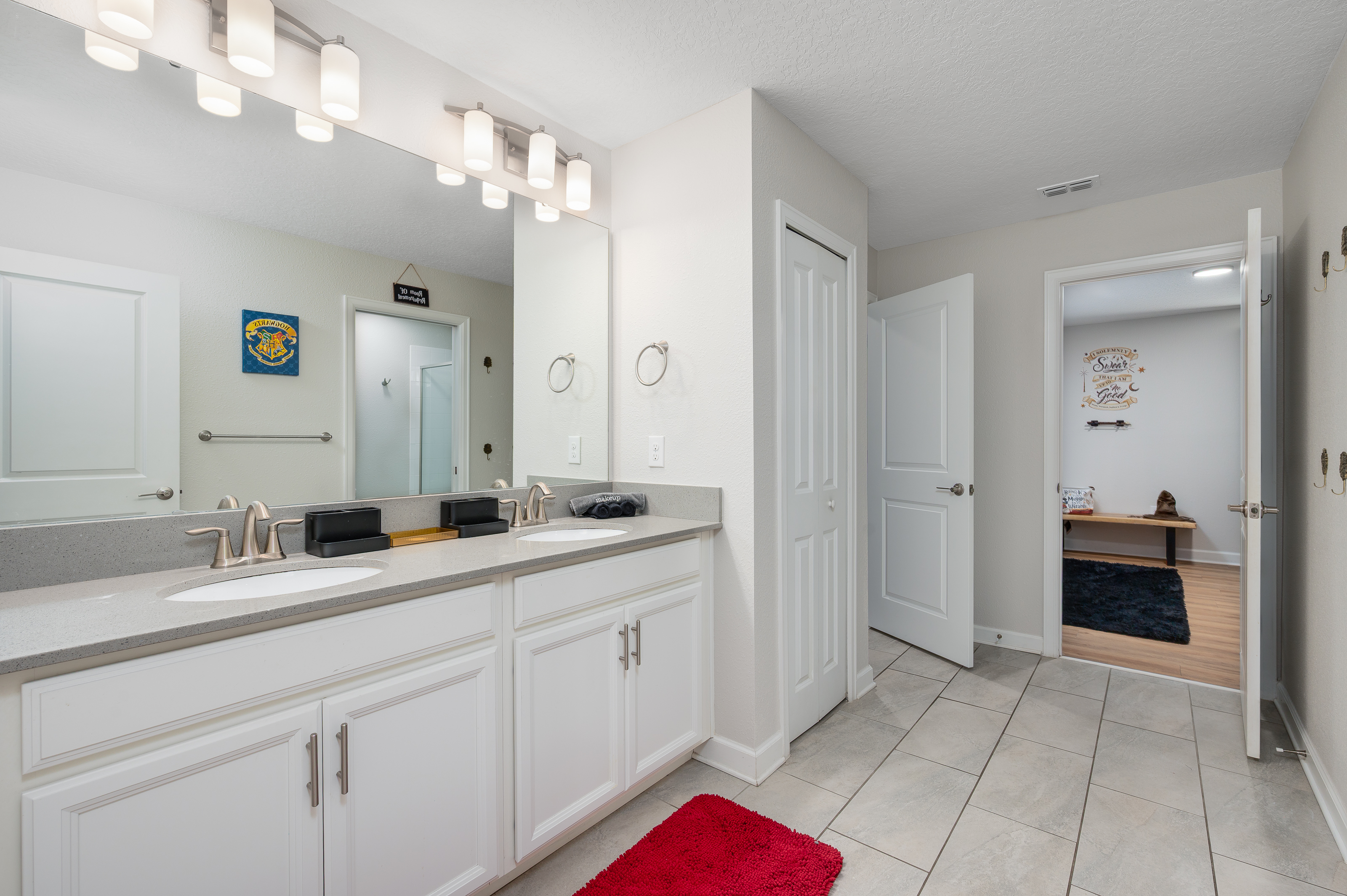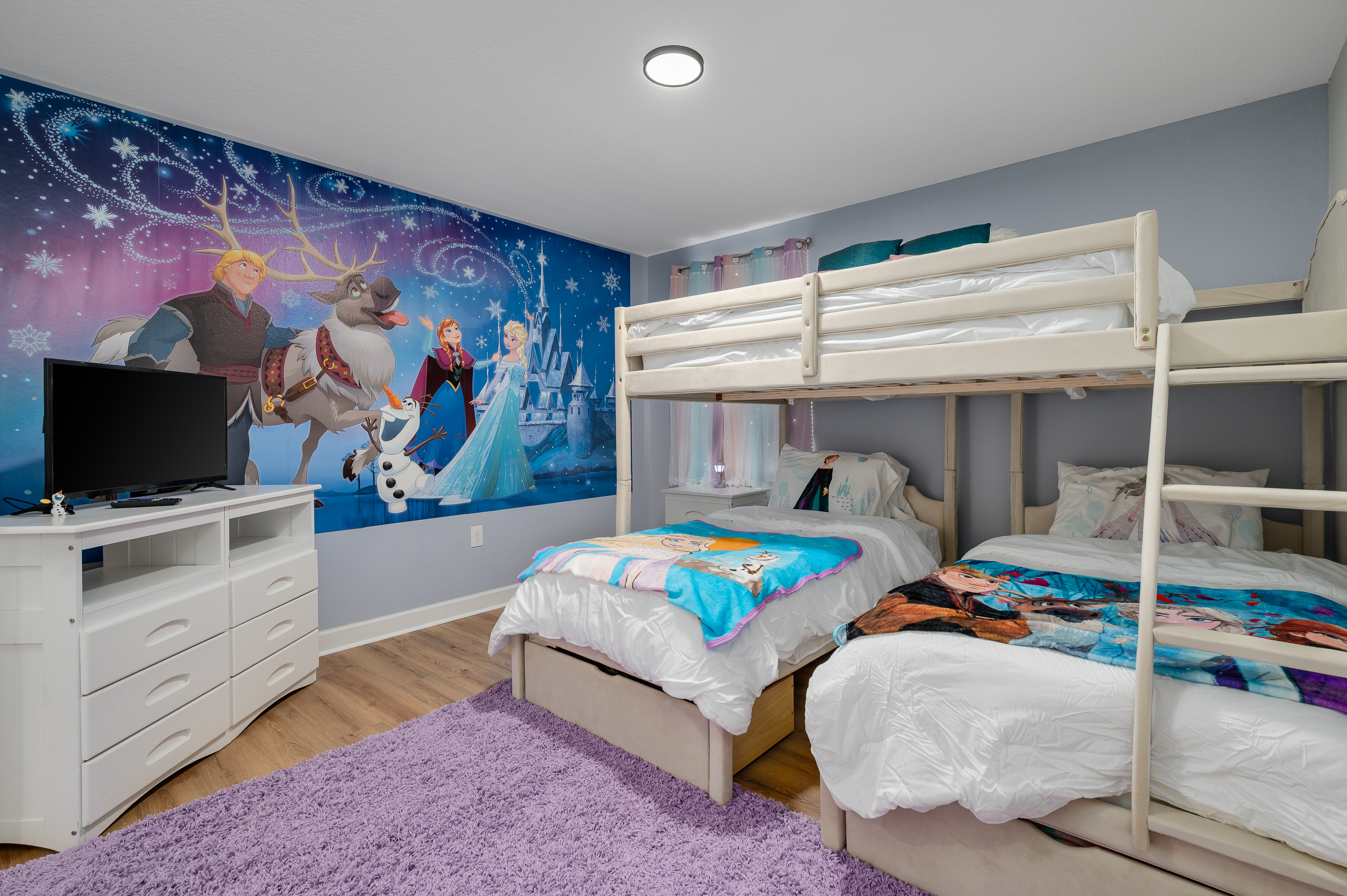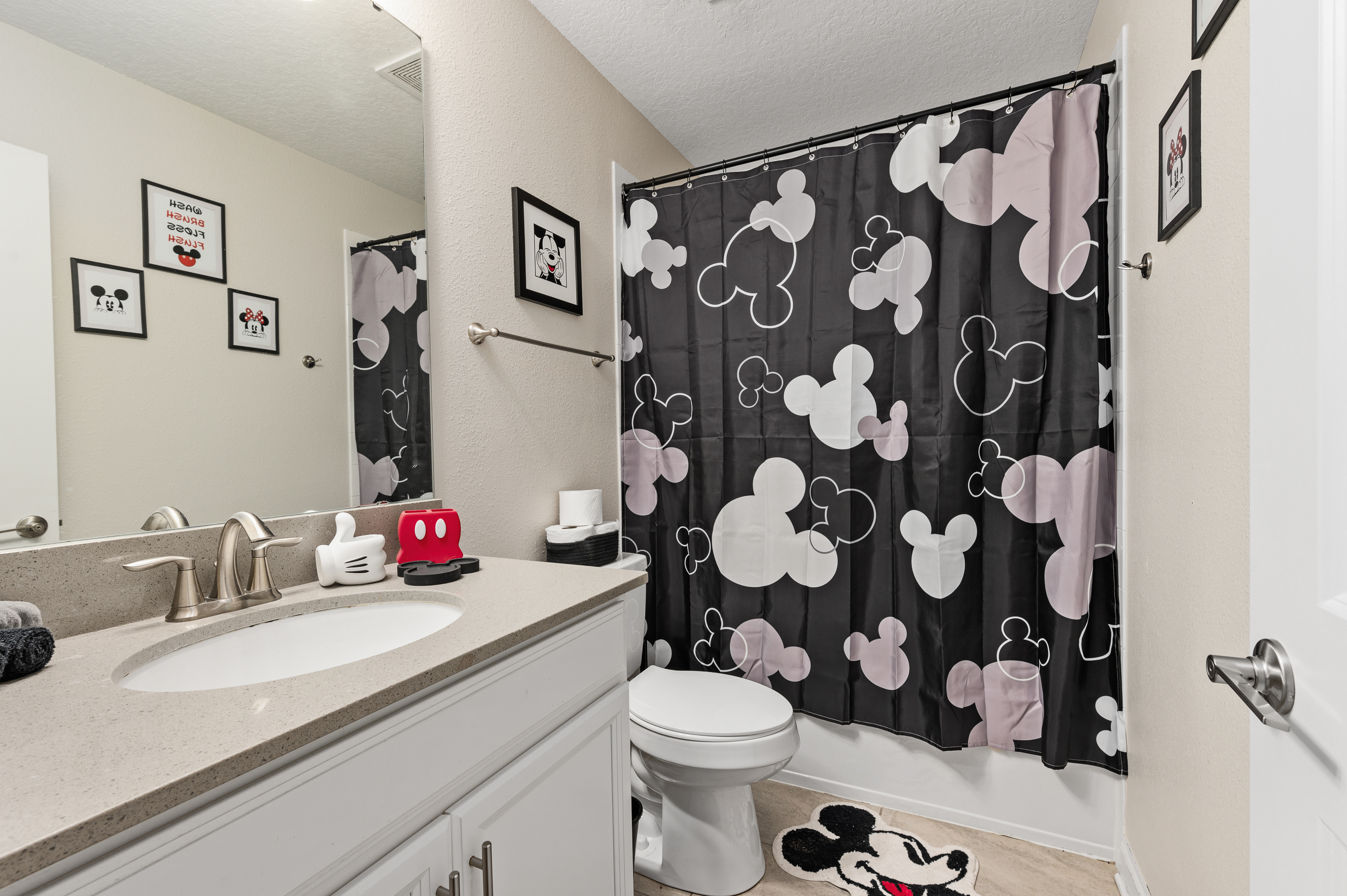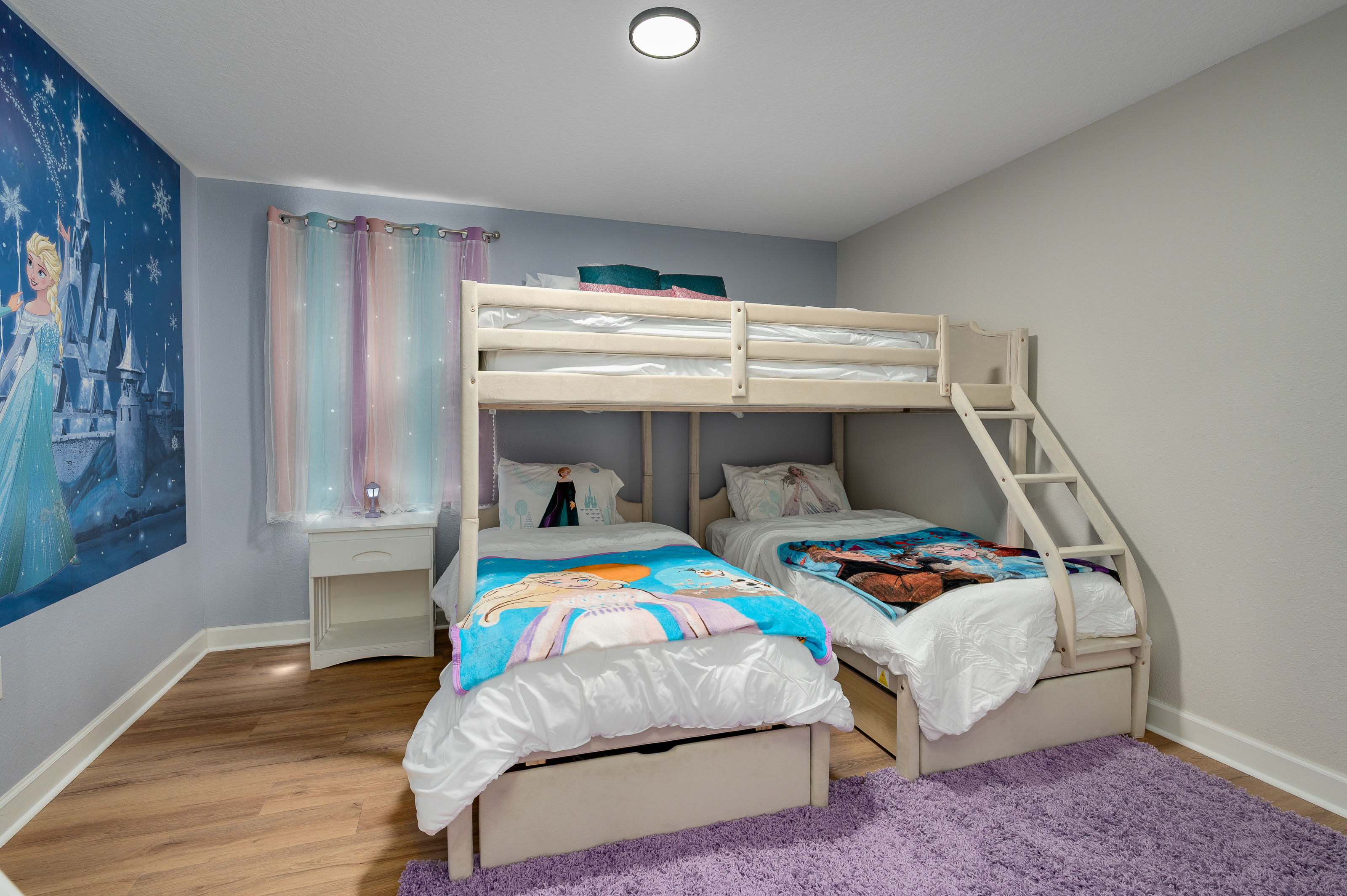 Upstairs, guests will find another entertainment zone with a foosball table and a basketball game—great for friendly competitions or relaxing with snacks and drinks. This floor also hosts six additional bedrooms, including imaginative Princess-themed rooms and Harry Potter–inspired rooms that add a magical touch to the stay. A laundry room and the remaining bathrooms are also conveniently located upstairs.