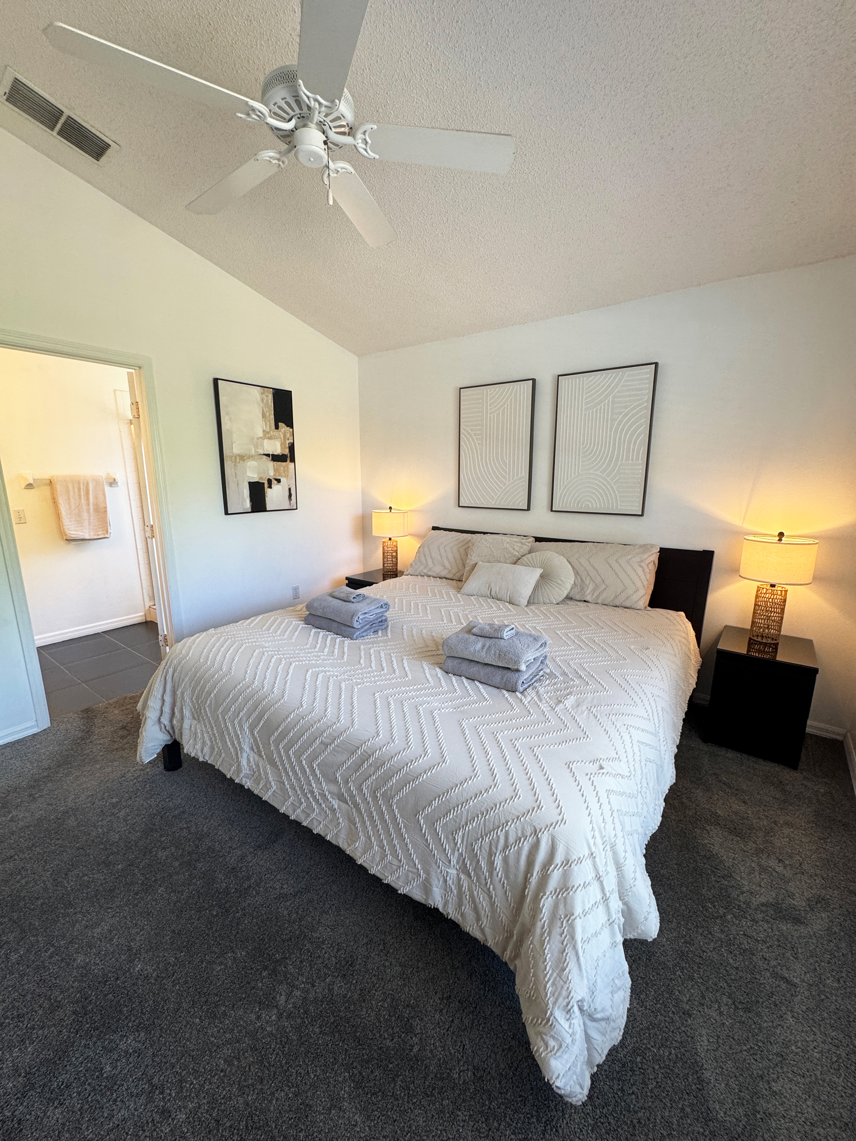 This single story home offers a large master suite with a king size bed. The second bedroom also has a king size bed and large tv. The third bedroom has two twin beds.